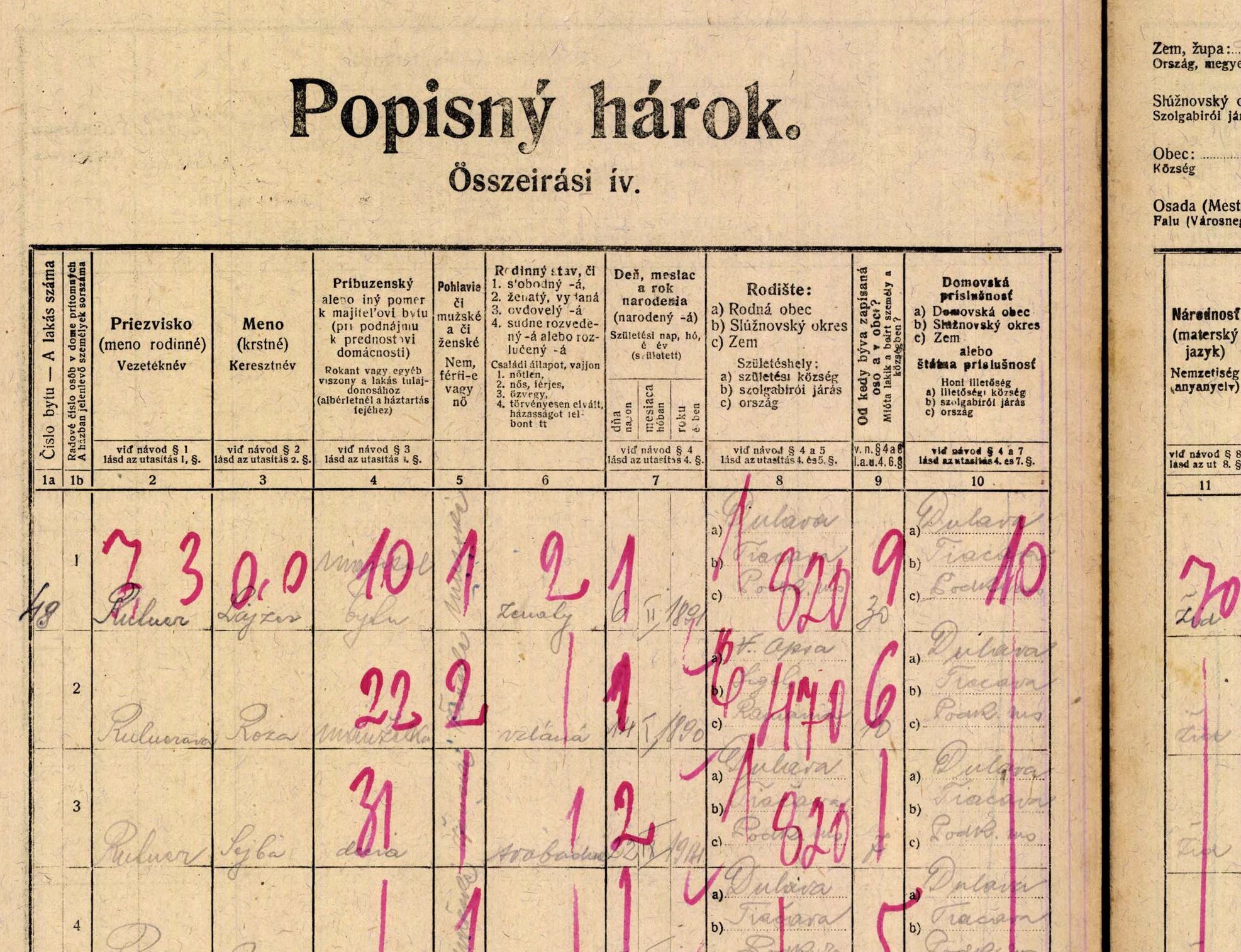 | Part of Lajzer Ruttner’s Family, 1921 Czechoslovakian Census, Dulfalva/Dulovo |