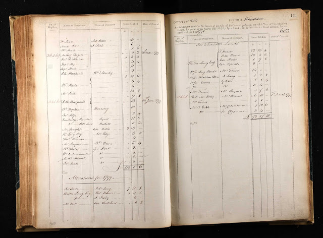 I wrote Part I of this series last week, saying: “Continuing my quest for finding the parents of my 3rd great-grandfather John Richman (1788-1867) in Hilperton, Wiltshire, England, I recalled that I had obtained digital images of the Hilperton and Whaddon Land Tax Assessment, 1773-1884 from Family History Library microfilm 1278837 (Items 23-24) over several years, but I have not copied all of the pages.”In Part I, I showed a map of 1773 Hilperton and a modern Google map satellite view of Hilperton showing that the road structure has not changed much, but the number of buildings and settlements have increased, as one would expect after 250 years. I also provided images of the 1773 tax list and the 1793 tax list, along with a list of persons with the names Richman, Rich and Marshman that were listed in the land tax assessments between 1773 and 1793. The list is:Hilperton Tax Assessment, 1773-1884 (FHL MF 1278837 Items 23-24)YearOwner NameOccupantTax £ – s – d 177317 John Richman18 – 11-1/4177417 John Richman11 – 11-1/4178025 John RichmanHimself1 – 5 – 3 178050 Mark Pikes HousesJno Richman & Abm Davis6 – 0 178057 Isaac Richman late PalmersHimself2 – 0 178120 John RichmanHimself1 – 5 – 3 178150 Mark Pikes houseJohn Richman & Tom Davis6 – 0 178158 Isaac Richman late Palmers2 – 0 178219 John RichmanHimself1 – 5 – 3 178249 Mark Pikes houseJohn Richman & Wm Davis6 – 0 178257 Isaac Rich late PalmersHimself2 – 0 178319 John RichmanHimself1 – 5 – 3 178349 Mark Pikes houseJohn Rich & Wm Davis6 – 0 178420 John RichmanHimself1 – 5 – 3 178450 Mark Pikes houseJohn Rich & William Davis6 – 0 178520 John RichmanHimself1 – 5 – 3 178550 Mark PikeJohn Rich & Wm Davis6 – 0 17865 Edward Eyler late HumphreysJohn & Wm Marshman &63 – 8 178620 John RichmanHimself1 – 5 – 3 178650 Mark PikeJohn Rich & Davis6 – 0 17875 Edw Eyler late HumphreysJohn & William Marshman & James Fyt3 – 8 178721 John RichmanHimself1 – 5 – 3 178751 Mark PikeJohn Rich & William Davis6 – 0 17884 Edw Eyler late HumphreysJohn & Wm Marshman & James Fyte3 – 8 178820 John RichmanHimself1 – 5 – 3 178850 Mark PikeJohn Rich & Wm Davis6 – 0 178920 John RichmanHimself1 – 5 – 3 178950 Mark PikeJohn Rich & Wm Davis6 – 0 179020 John RichmanHimself1 – 5 – 3 179050 Mark PikeJohn Rich & Wm Davis6 – 0 179120 John RichmanHimself1 – 5 – 3 179149 Mark PikeJohn Rich6 – 0 179220 John RichmanHimself1 – 5 – 3 179249 Mark PikeJohn Rich6 – 0 179320 John RichmanHimself1 – 5 – 3 179349 Mark PikeJohn Rich6 – 0 The numbers in the second column are the lines from the first name on the list. For 1793, John Richman is the 20th line down the list and Mark Pike is the 49th line. These line numbers change slightly over time.A) I want to highlight my conclusions about the lists, the persons with these names, and then develop questions I still have about them.1) The lists are remarkably consistent year to year, with only minor changes to them as property changes hands, or the owner’s name changes, or the occupier’s name changes. For instance the John Richman on about line 20 is always between owners 19 Samuel Bethell and 21 John Brookes. In 1787, 21 John Gale replaces John Brookes, through 1793.2) The John Richman on about line 20 for every year 1773 to 1793 owns the property and resides on the property. The tax is 1-5-3 from 1780 to 1793. Based on the probate records for William Richman (1690-1769) and John Richman (1724-1807), both blacksmiths, my hypothesis is that the John Richman in the tax lists is the John Richman (1724-1807) who married Mary Crabb.3) On about line 50, for Mark Pike’s houses, the following names appeared starting in 1780:* John Richman in 1780-1782 as one family occupying a house* John Rich in 1783-1793 as one family, occupying a houseThere is at least one other John Richman in the Hilperton parish register with children baptized in the 1773-1793 time frame – John Richman (1744-1802) who married Mary Parsons. A John Rich and wife Mary appears in the Hilperton parish register with children baptized in the 1788-1792 time frame. Is that the father of my 3rd great-grandfather John Rich (1789-1868)? There are several examples of a Hilperton Richman using the name of Rich in records. Is that the case here? Is John Rich on the tax list 1783-1793 the same person as John Richman on the tax list 1780-1782? I think there is a possibility of that. On the other hand, this may just be a coincidence.4) On about line 5, for Edward Eyler’s house formerly Humphreys, William and John Marshman were occupiers in 1786 to 1788. Both William Marshman (1741-????) and John Marshman (1747-????) have children baptized in Hilperton in the 1773-1790 time frame. They are brothers. The Marshmans are not on the tax lists after 1788. Did they move away from Hilperton?Unfortunately, I do not have the tax lists after 1793. The microfilm goes up to 1884, but the microfilm can be viewed only at the Family history Library in Salt Lake City. B) There is also a tax redemption list for 1798 on Ancestry. A search for “Rich” in Hilperton found: